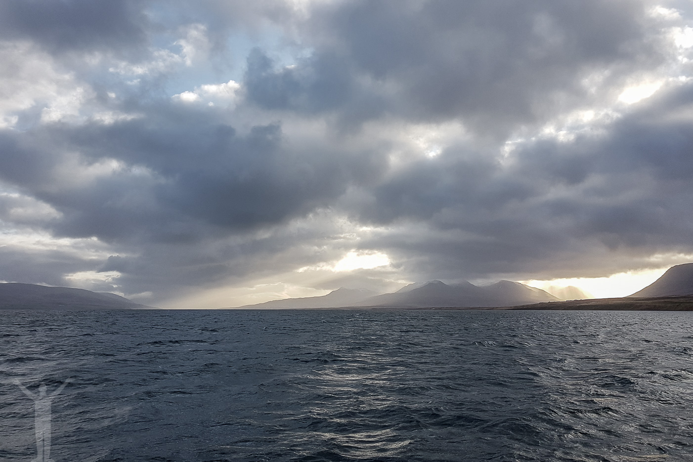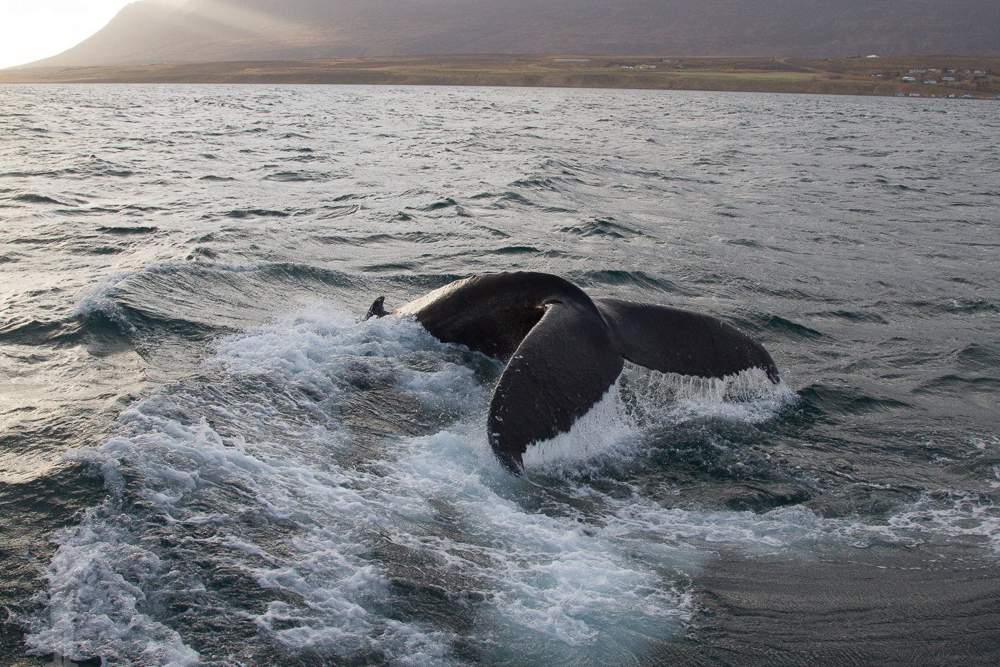 Tidig lördagmorgon och solen håller precis på att orka sig över bergsmassiven kring Akureyri. Vi har vaknat i våra sängar och efter gårdagens konstanta regnande är vi mer än glada över att för en gångs skull se en himmel och dess morgonfärger. Som vanligt på den här resan har vi inte bestämt oss för dagens planer men vid frukosten konstaterar vi att vi borde hinna med minst ett vattenfall. Så dyker dagens andra plan upp, lite ur ingenting. Valsafari på Island.