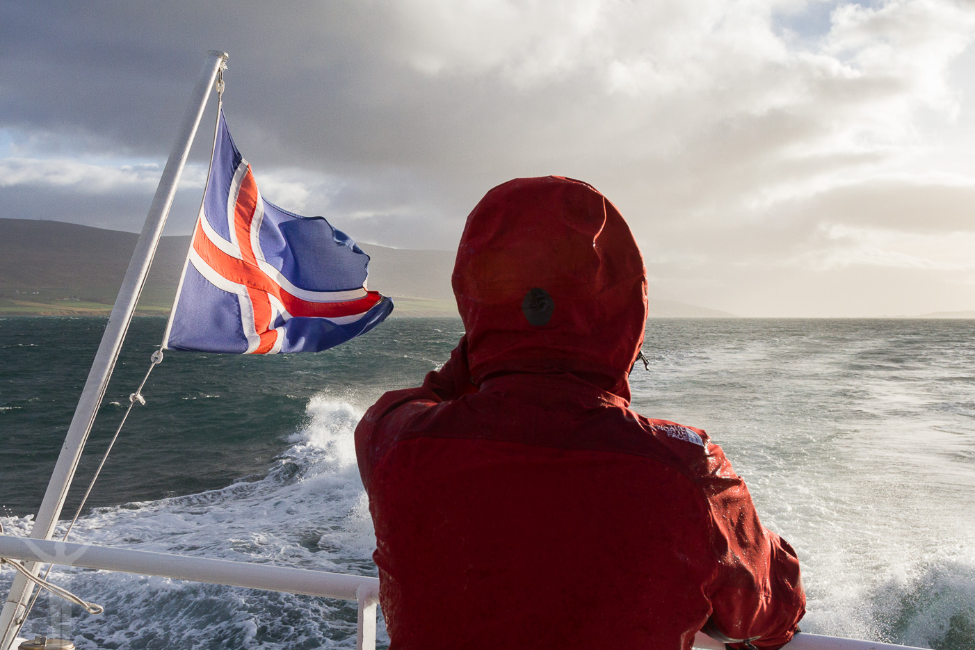 Vågorna slår mot båten och stora vattenkaskader sköljer över oss som valt att stå ute på däck. Det är svinigt kallt när vi i hög fart kommer allt längre ut i fjorden. Vi ser vårt guesthouse, som låg alldeles nere vid vattnet och så ser vi bilarna på väg 1 som försvinner in i fjällmassivet i väster.