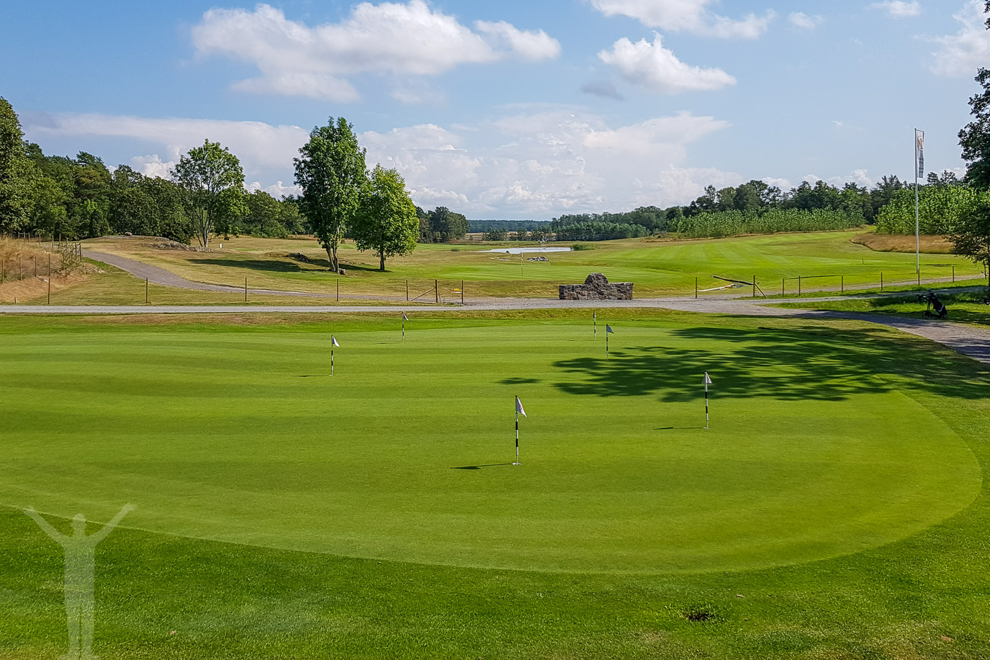 Övningsgreenen ligger precis framför klubbhuset och var i utmärkt skick. Den här dagen kändes den väldigt snabb, vilket också skulle spegla de flesta av greenerna även ute på banan.
