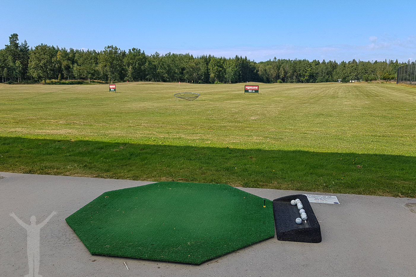 Vad som dock inte ligger direkt vid klubbhuset är rangen. Den ligger på andra sidan parkeringen, en driver bort (250 meter alltså). Har man all utrustning med sig och checkar in digitalt behöver man aldrig in till klubbhuset först. Vi behövde dock hyra vagn och gå på muggen så det blev lite promenader fram och tillbaka.